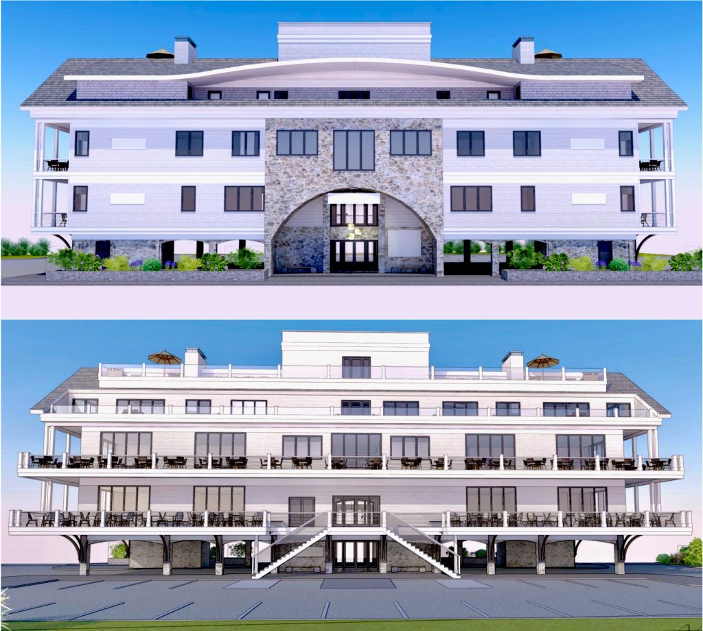 The conceptual plans shared with the town show a four-story building with wrap-around decks on the second and third floors plus a roof deck. The building is elevated 11 feet above the ground on pillars to protect it from storm tides. The top of the building is 64 feet high. Including the exterior decks, there is 22,350 feet of space on four floors.