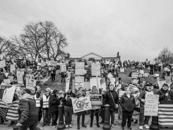 Boisterous crowd gathers on the waterfront to protest Trump.