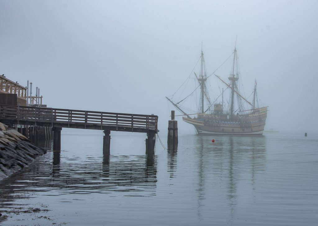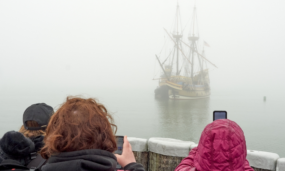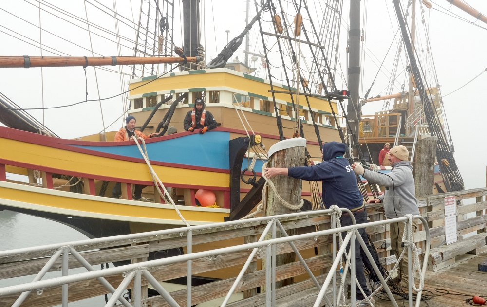 The Mayflower II returned to Plymouth Harbor and its berth at State Pier on Thursday after spending the winter undergoing maintenance in Mystic Seaport. The 102-foot-long replica ship left Connecticut Wednesday morning and by Thursday morning was making its way through Cape Cod Canal. It arrived in Plymouth around noon, draped in a shroud of fog, completing the 78-mile voyage.