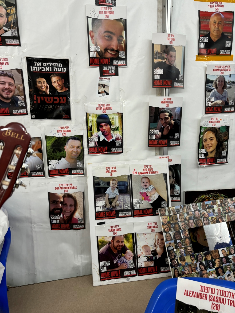 I was also struck with how eerily empty the usually bustling airport was. Our El Al flight was the only one that arrived in the entire airport and as I made my way towards customs, I saw poster after poster of the hostages with red and black “bring them home” banners covering any space where there wasn’t a poster. As my cousins drove me to their home to spend Shabbat, I saw the posters and banners at every bus stop and on fences and billboards. Israeli flags hung from nearly every balcony and window.