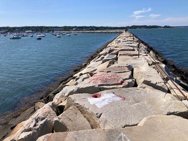 The jetty was constructed in the late 1960s by the U.S. Army Corps of Engineers at federal expense to provide additional protection for the harbor. According to Plymouth Harbormaster Chad Hunter, even Long Beach was inadequate protection from waves six to eight fee high, and winter ice floes that sometimes swept around the point. Both were capable of doing “significant damage to moored vessels and infrastructure,” according to Hunter.
