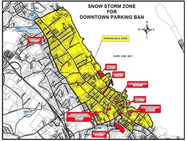 The town said the parking ban will apply to “areas between the ocean and the following boundary: Beginning at the eastern end of Hedge [Road]., west to Court Street, across Court St. to South Spooner St., west on South Spooner St.to Standish Ave., south on Standish Avenue to Samoset St., east on Samoset St. to Oak St., south on Oak St.to Summer St., east on Summer St.to Pleasant St., south on Pleasant St. to Robinson St., west on Robinson St. to Mayflower St., south on Mayflower St. to South St., east on South St. to Sandwich St., and south on Sandwich St. to the entrance of Stephens Field.”