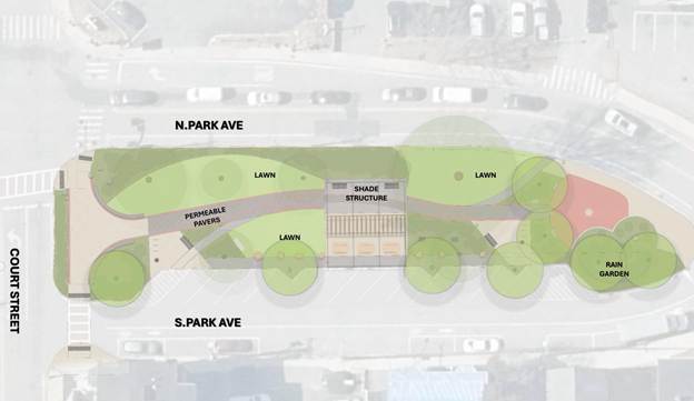The town wants to make the park more pedestrian friendly by putting in pervious pavers, removing diseased trees and adding others, and constructing a path with embedded railroad ties and a covered pergola with string lights.