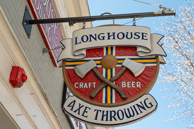 A downtown curiosity, still slightly south of Town Hall, is Long House Axe Throwing on Main Street. Frankly, I didn’t know axe throwing was a thing, but I was ill-informed. It immediately called to mind the actor Ed Ames, who played a Cherokee named Mingo on the 1960s TV show “Daniel Boone,” demonstrating his tomahawk throwing skills on “The Tonight Show” starring Johnny Carson. If you’ve never seen it, treat yourself to one of the greatest moments in the history of late night and you’ll immediately grasp the appeal of axe throwing.