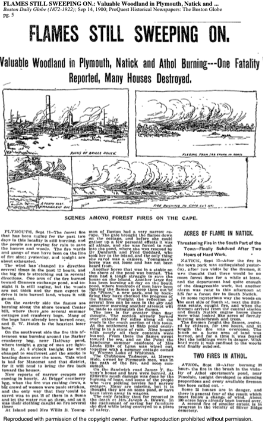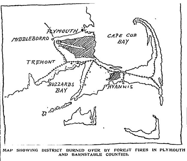 “A Globe man today drove from Ship pond into Wareham. a distance of more than 2 miles, and everywhere there was a black mass of burned woodland. The greater part of the burned district was covered with a growth of scrub oaks and underbrush, but there was also destroyed some of the very best pine wood in the town.”