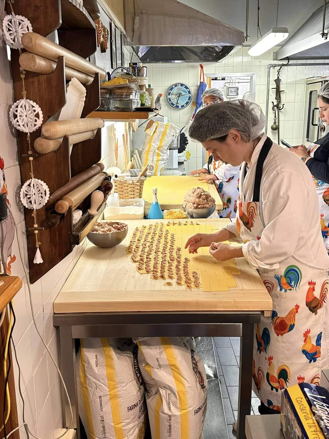 Production begins with the making of the ping, or the filling. If anything sparks debate, it is the ping. During a trip to Bologna for Christmas in 2019, friends brought us to a traditional tortellini shop. What struck me immediately was the color of the ping. I asked our friends why the ping was pink. Somewhat shocked at the question, our friends informed us that to be considered an official Bolognese tortellini, they must contain pork, grated Parmesan cheese, egg, mortadella, salt, pepper, nutmeg and Bolognese prosciutto.
