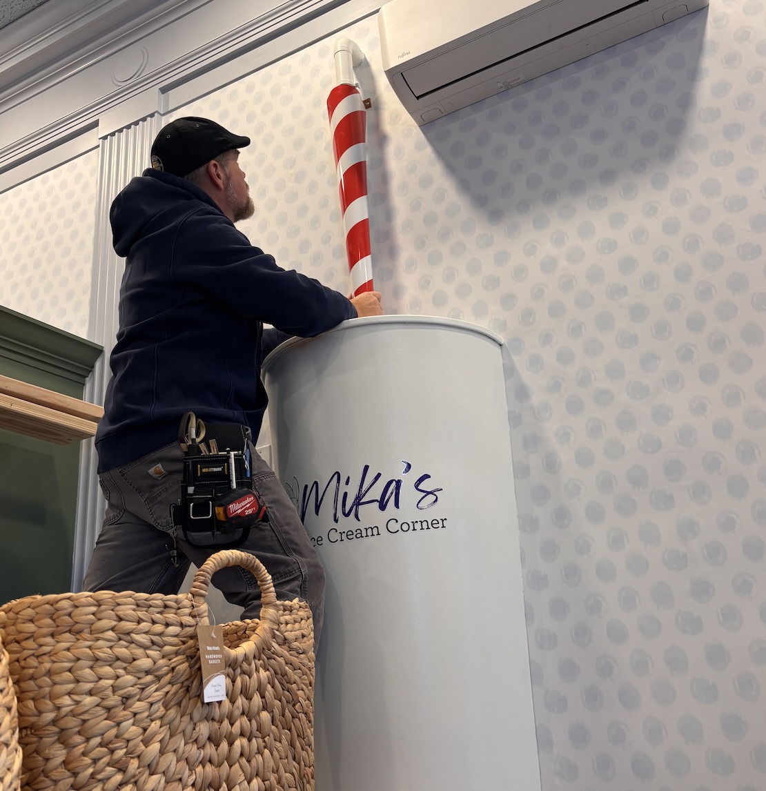 On the other side of the room, someone is turning a painted pipe into a huge straw by wrapping it in the style of a candy cane. The bottom part disappears into a similarly outsized cup labeled “Mika’s,” the name of the ice cream counter.