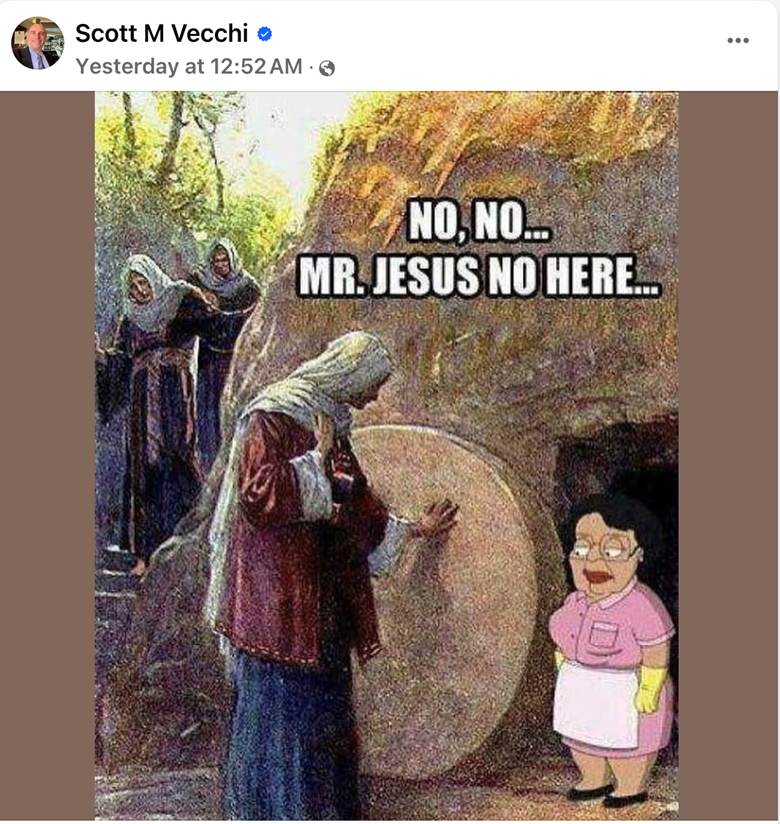 At 12:52 a.m. on Easter Sunday, Vecchi posted a racially insensitive meme on his Facebook page featuring a cartoonish figure of a Hispanic woman apparently dressed as a housecleaner. She is shown standing at the open tomb of Jesus and telling one of his disciples, “No, no, Mr. Jesus no here.”