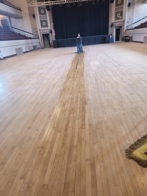 One of the custodians used a machine to clean the floor. Brindisi said it applied water to the floor to suppress the dust particles.