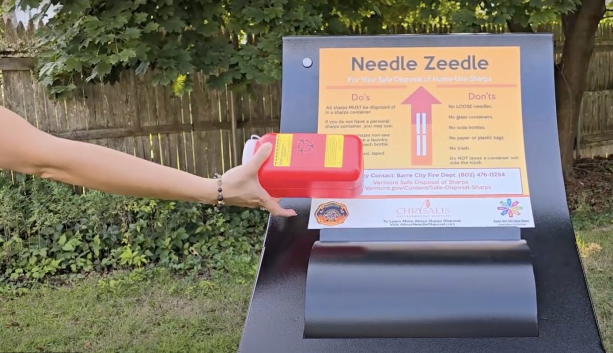 The so-called sharps disposal kiosk was made by Chrysalis Environmental Services, a Connecticut-based company that says it “produces products, services and educational programs to ensure the safe and environmentally friendly disposal of residential medical waste.”