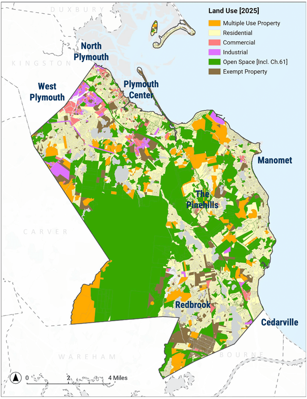 According to the report, Plymouth’s total land area is 65,920 acres. Of that, 28,177 (43 percent of the total) are protected open space, including the massive Myles Standish State Forest, which spans more than 11,000 acres in Plymouth. For comparison, the entire town of Kingston has about 11,900 acres of land.