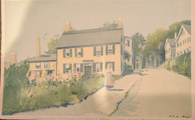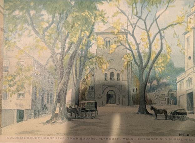 After college, the chance discovery of a postcard depicting a long-gone Plymouth building ignited a lifelong passion for collecting local postcards and deepened my love of the town’s history. Among my favorite cards – and I own thousands of them – are those from the late 1890s and early photo postcards depicting private homes. One set depicts historic scenes and buildings in Plymouth – copies of beautifully rendered watercolors. The cards are signed “HCD” and dated 1920.