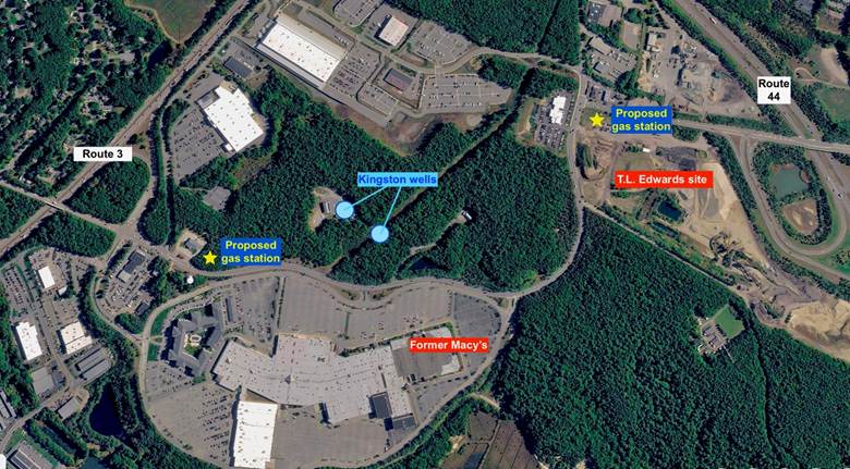 Three public water supply wells are within the protection zone. Two Kingston wells are next to the mall property, about 2,000 feet from the T.L. Edwards site. One Plymouth municipal well is about 2/3 of a mile to the south, in the Industrial Park on the other side of Route 44.