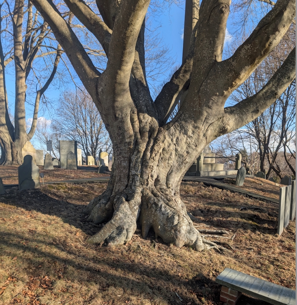 The location of the Baxter baby’s stone is dominated by a large beech tree. The roots revealed fragments of a marble and brownstone gravestone. typical of the 1850s (when the child died). Cheryle also used postcards from the 1890s to further narrow the search area. The Baxter plot is in the vicinity of the Cushman monument which was a popular postcard scene during that period.