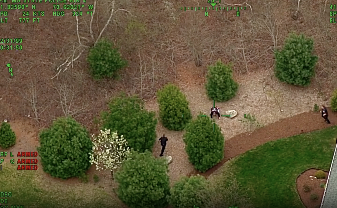 About a dozen officers, including Abe the dog, from the Plymouth County sheriff’s department, were involved in the chase, which began at around 8:30 a.m. State police in a helicopter tracked Julian’s movements, broadcasting his whereabouts to officers on the ground. They caught the episode on video, which culminated with an apparently exhausted Julian raising his arms in surrender and slumping to the ground.