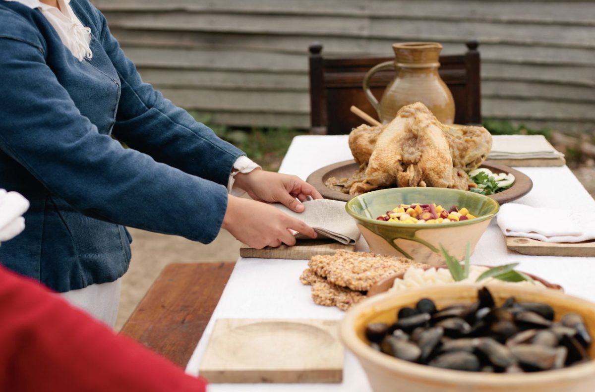 The harvest feast is a party-like celebration, according to VanWormer. The Pilgrim reenactors wander around and chat with people, telling them about the first Thanksgiving, explaining the menu items, and singing. The food is served family style. There are no forks – you can eat with your fingers, and your napkin goes over your shoulder or on your lap.