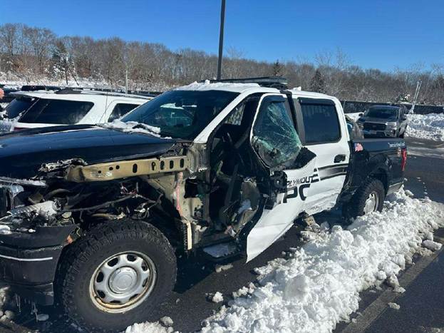 One Plymouth officer received minor injuries after a truck driver lost control on a slippery Long Pond Road. Credit: (Plymouth Police photo)